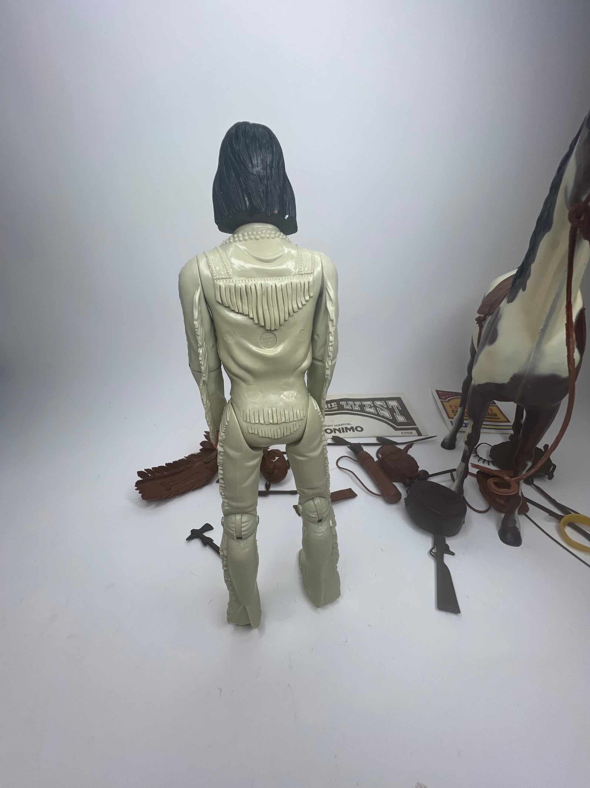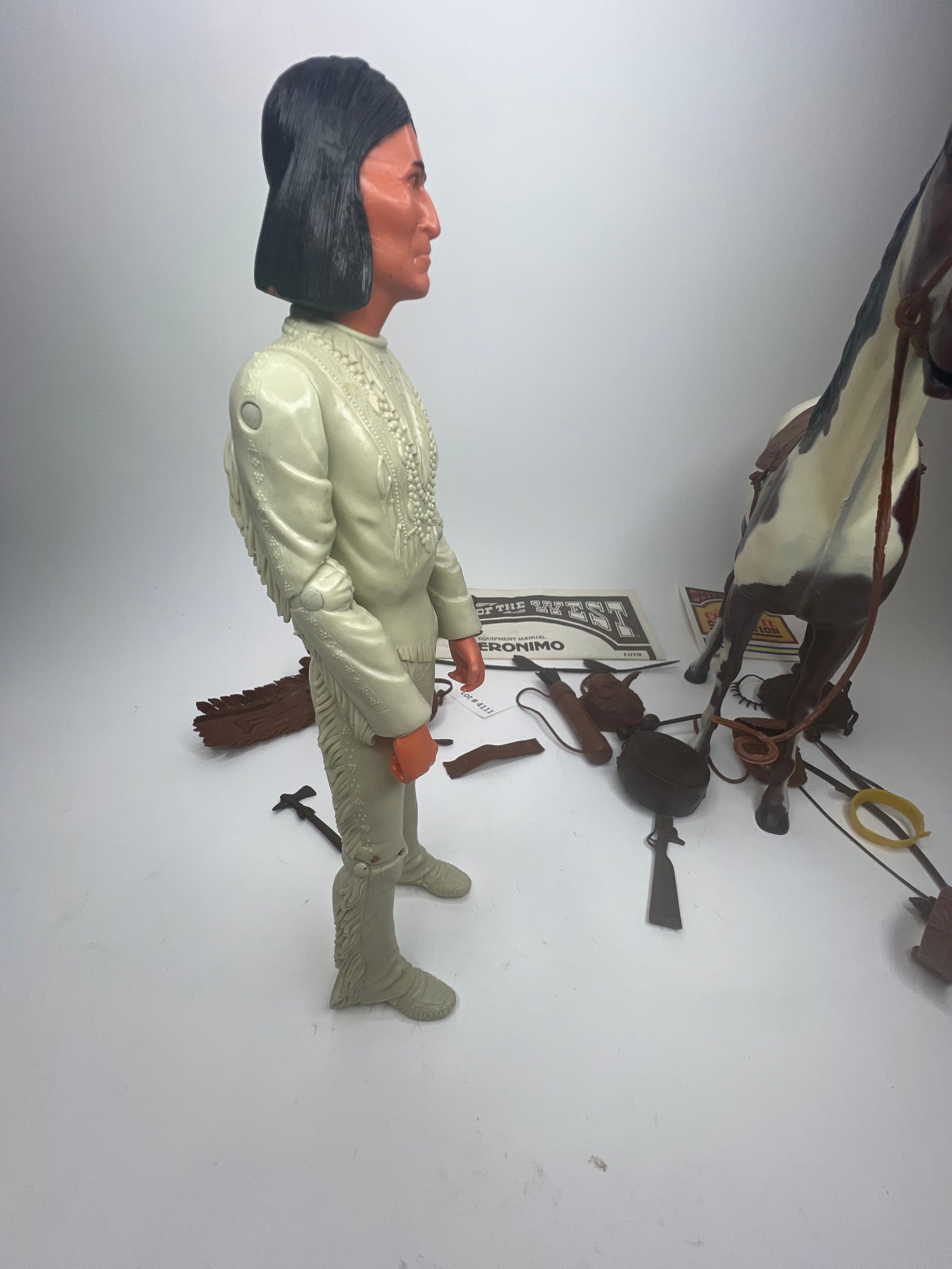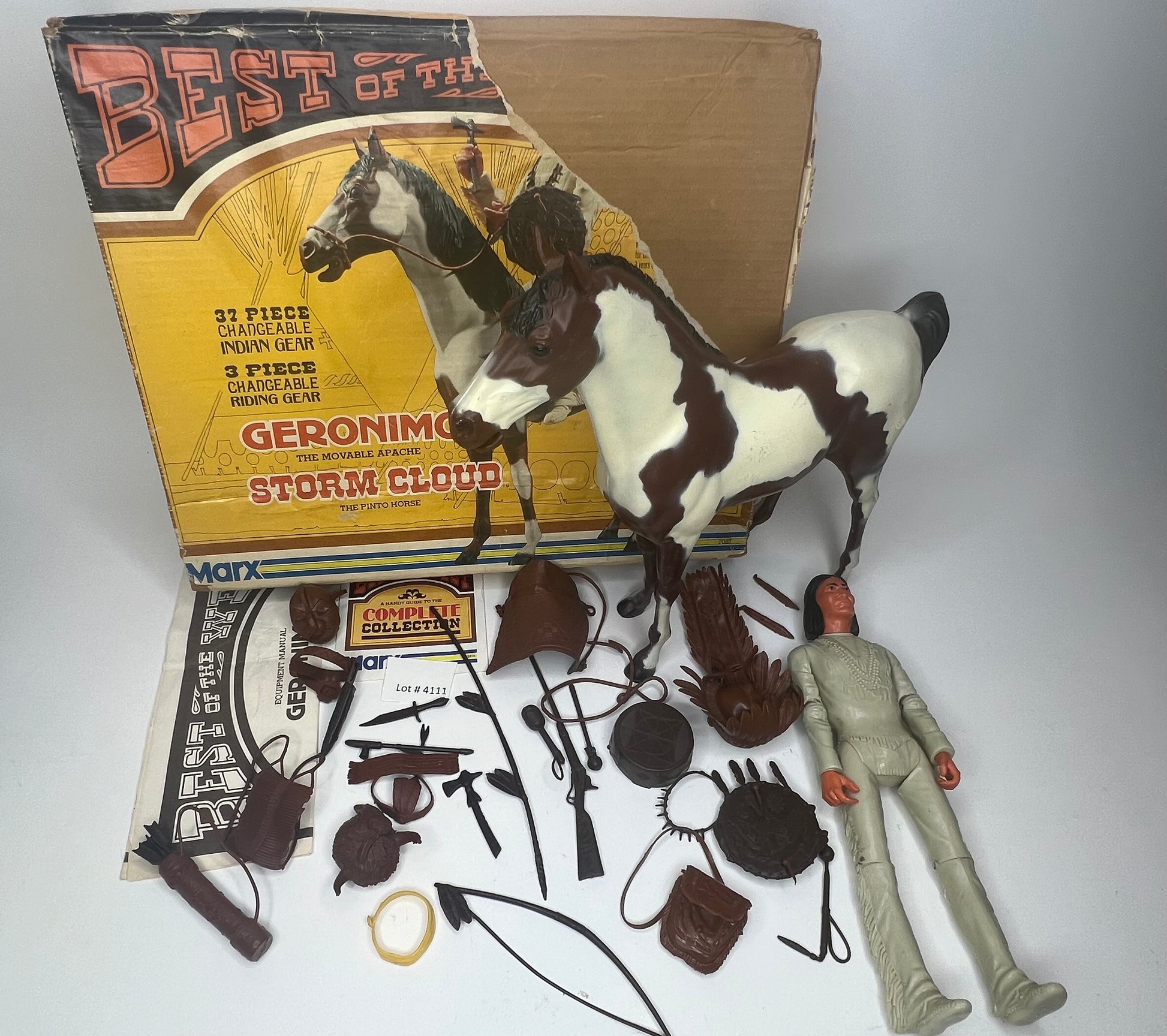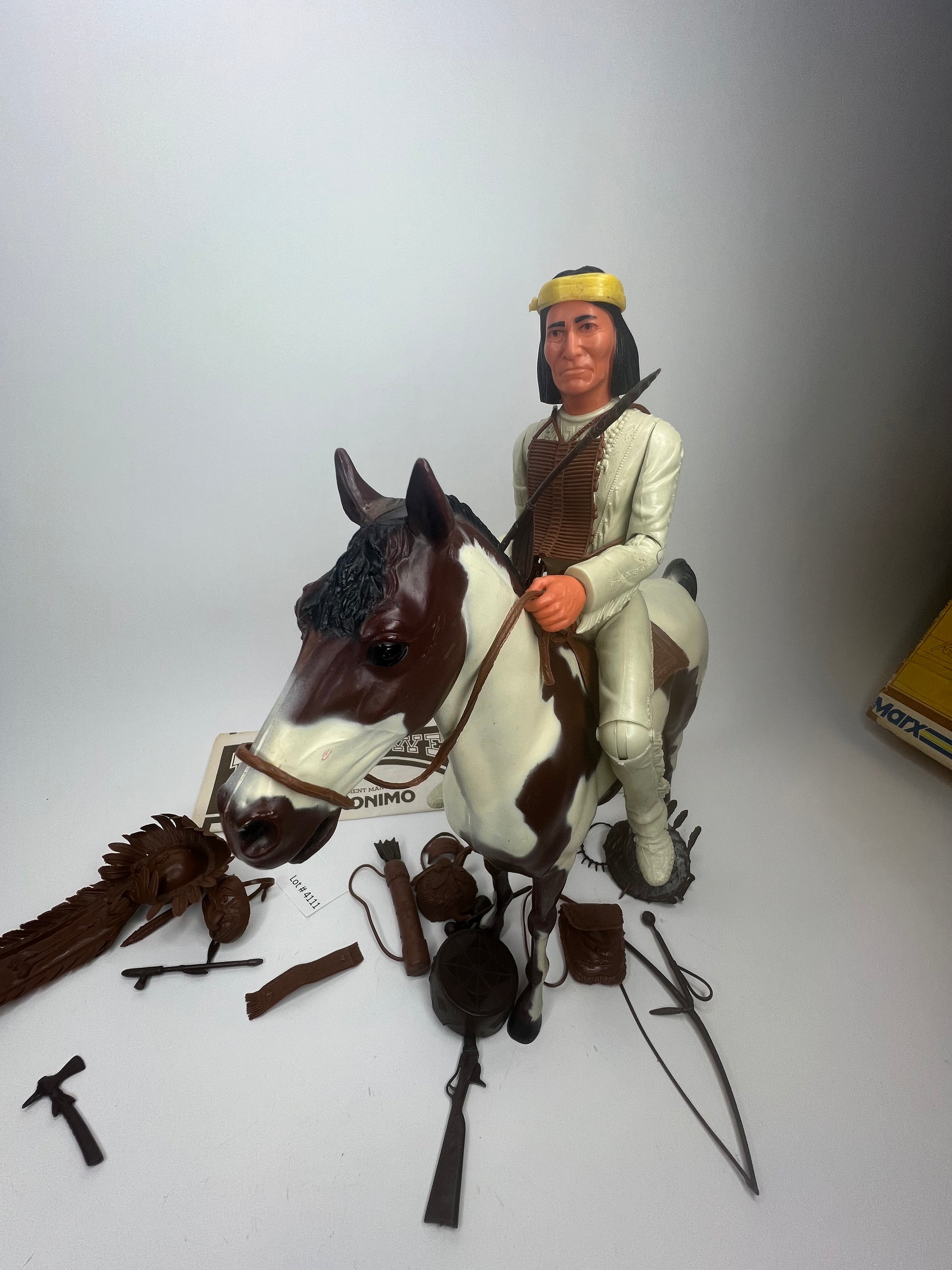 Geronimo in a Rare Mailer Box! These are by far the most elusive Geronimo combos out there ! I have only had 2 of these in over 25 years ! The Best of the West (BOTW) box has a piece off cover but still a very rare box with mint contents . This was my first acquired in 1998 used in my Encyclopedia that so many of you have seen. This set has a C9-C9+ Geronimo and comes with 37/37 minty accessories. The horse is a c8 + -C9 with minor melts. The Orig Copy instux included with color guide. Perfect set if you are looking for something harder to find in a box with really nice contents.
