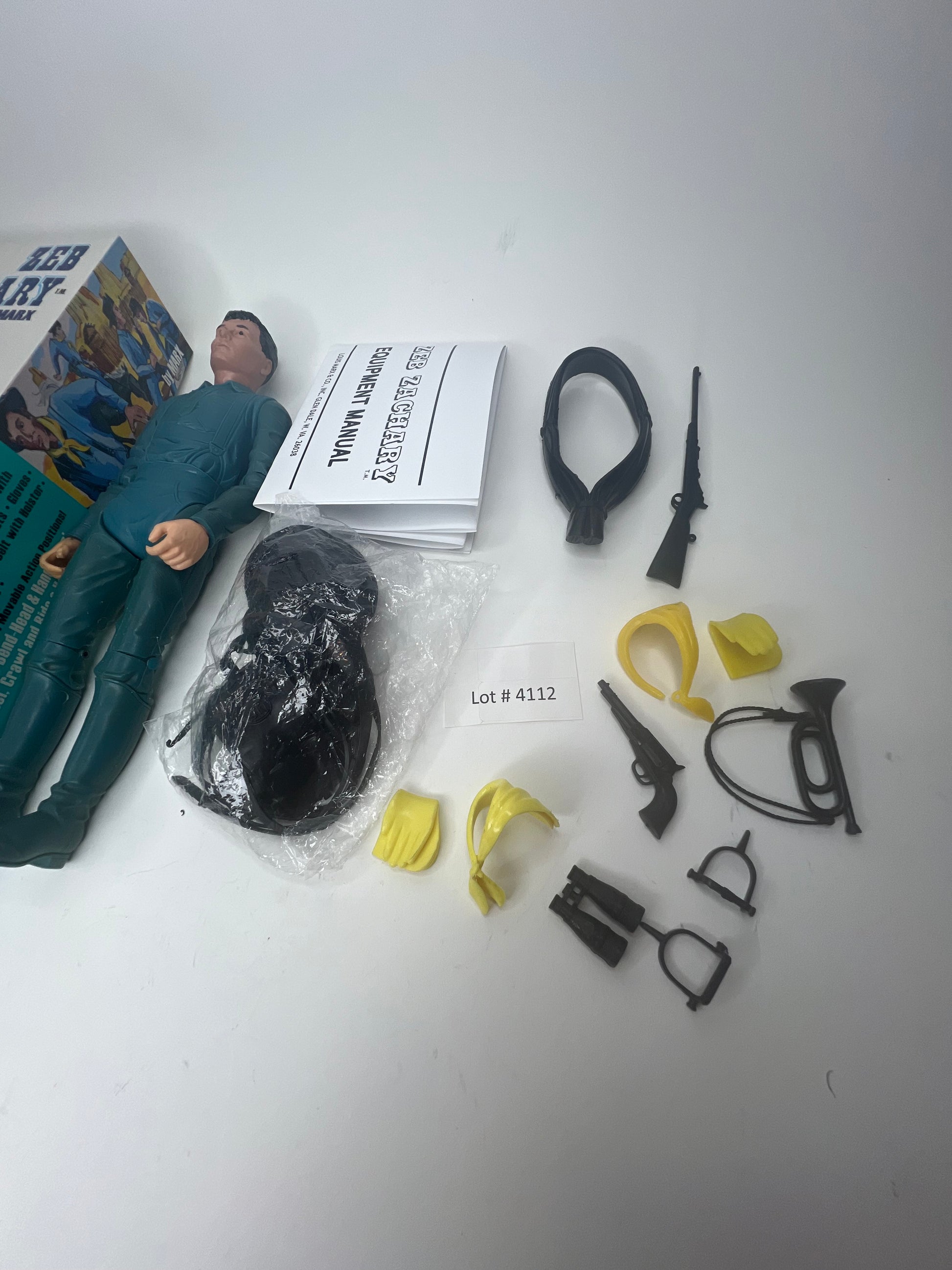 Custom Zeb Zachary set for Fort Apache Fighters! The reproduction box is beautiful with instrux copy. Vintage first issue figure with custom zeb head in the box; C9-C9+ vintage figure. Includes 21/22 accs missing sword. Hard accessories are vintage black. The viny are recast unopened accessories in black. The orig neckerchief is flawed but I included as a bonus a set of vinyl gloves and mint vinyl neckerchief. The chance to get a new recast Nice Holster with hooks! Copy of FAF instrux! Free US shipping! See pics of set.