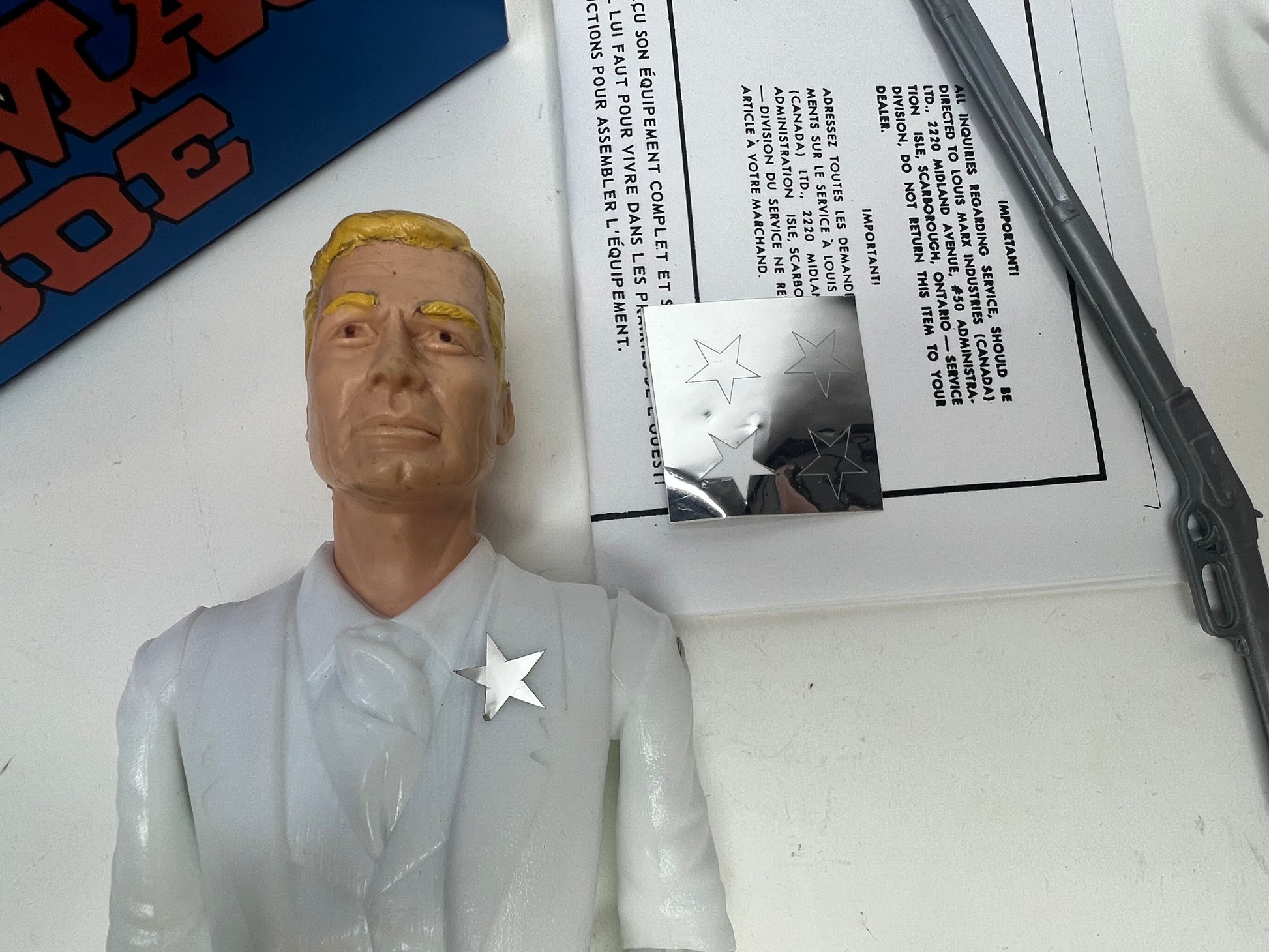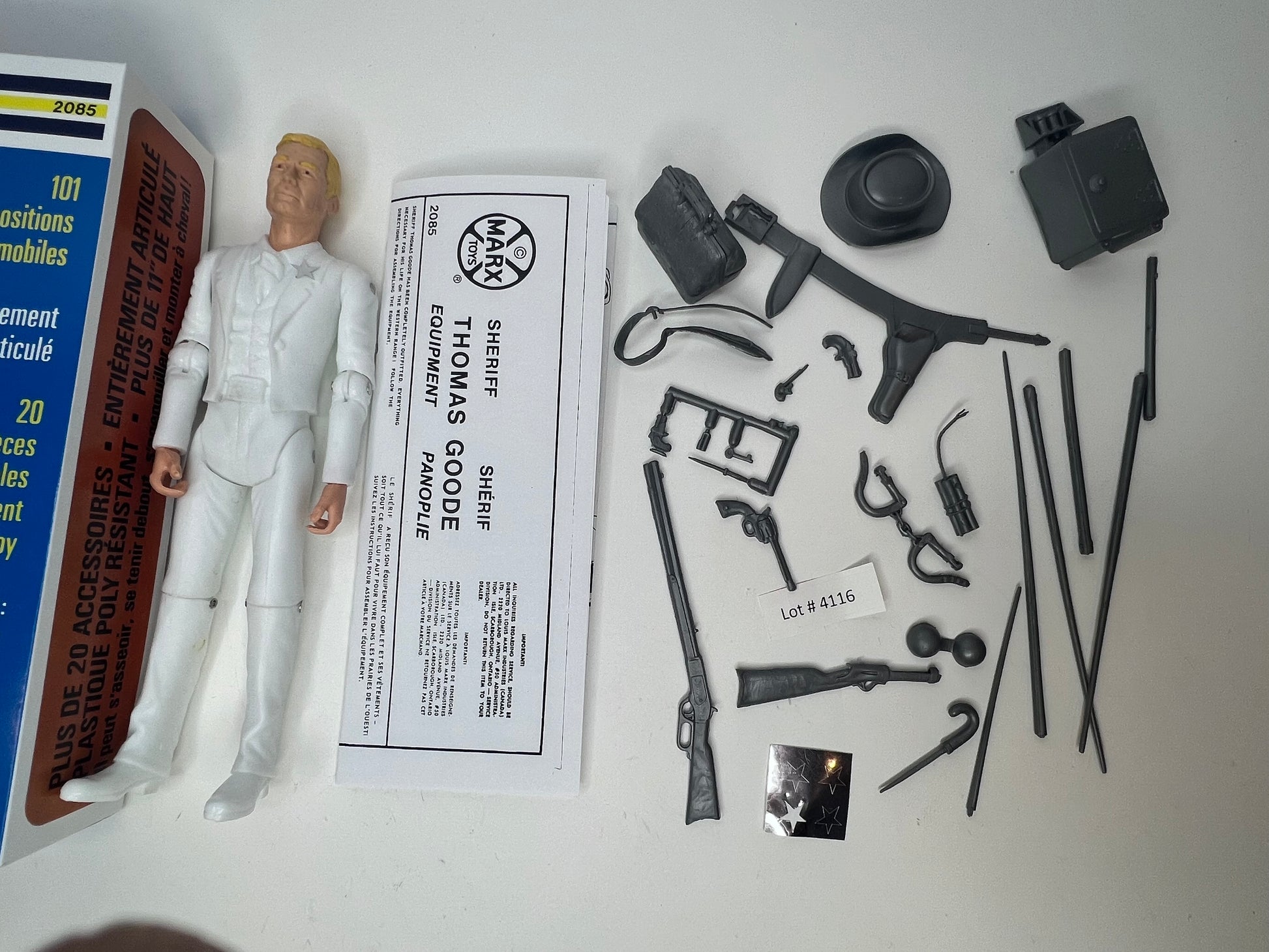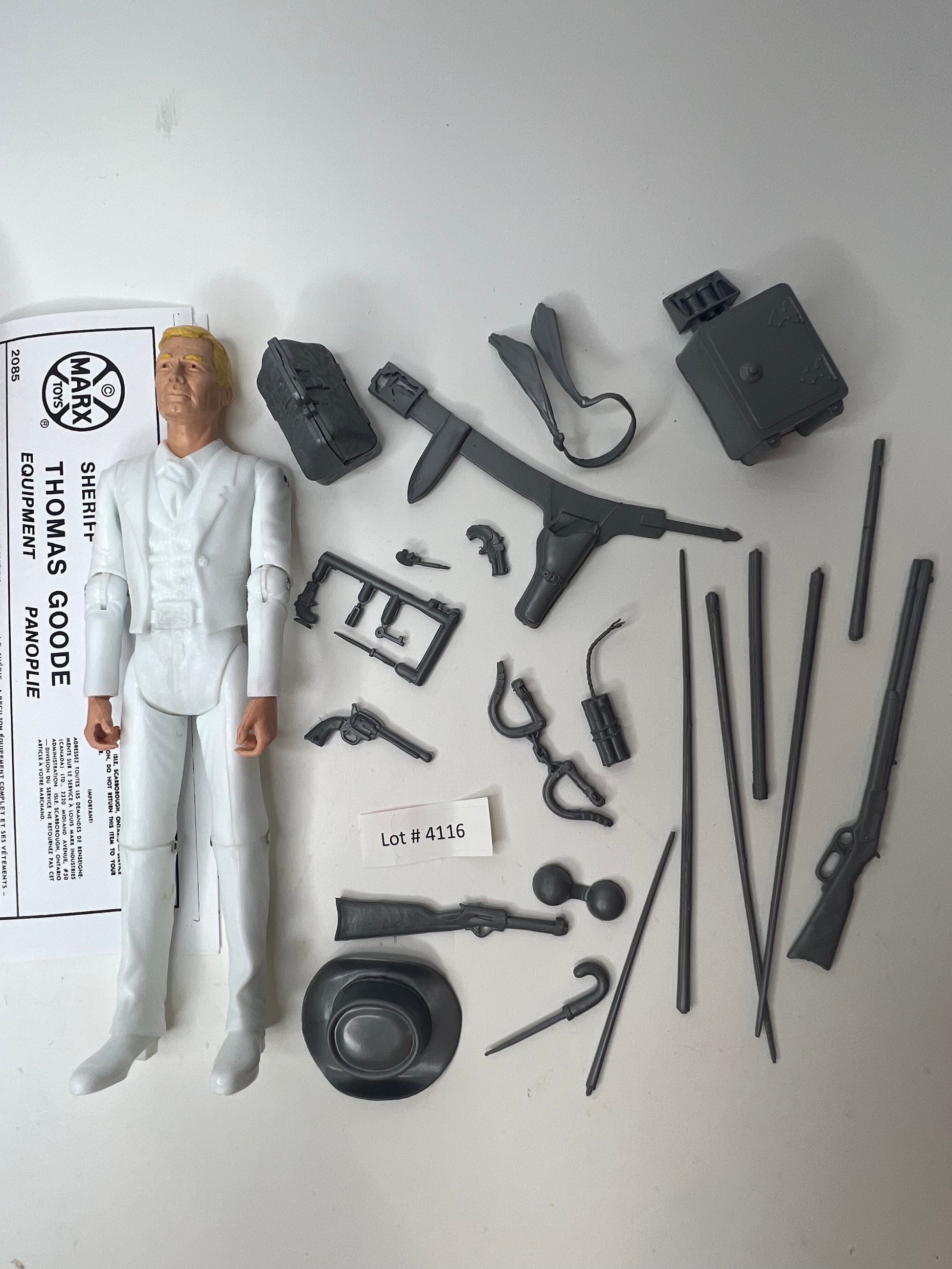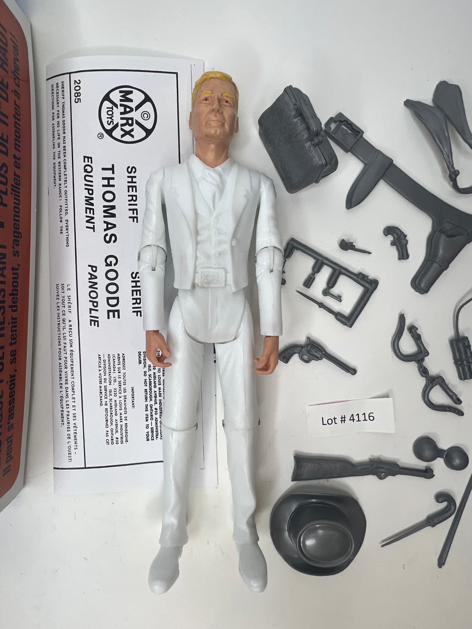 Nice Sheriff Thomas Goode Recast figure, comes with a custom Blue MOD box Has a set of gray/silver recast hard accessories. Note the holster has a factory flaw. Includes custom reproduction MOD box, reproduction stars and instructions copy. See pics of this wonderful recreation !