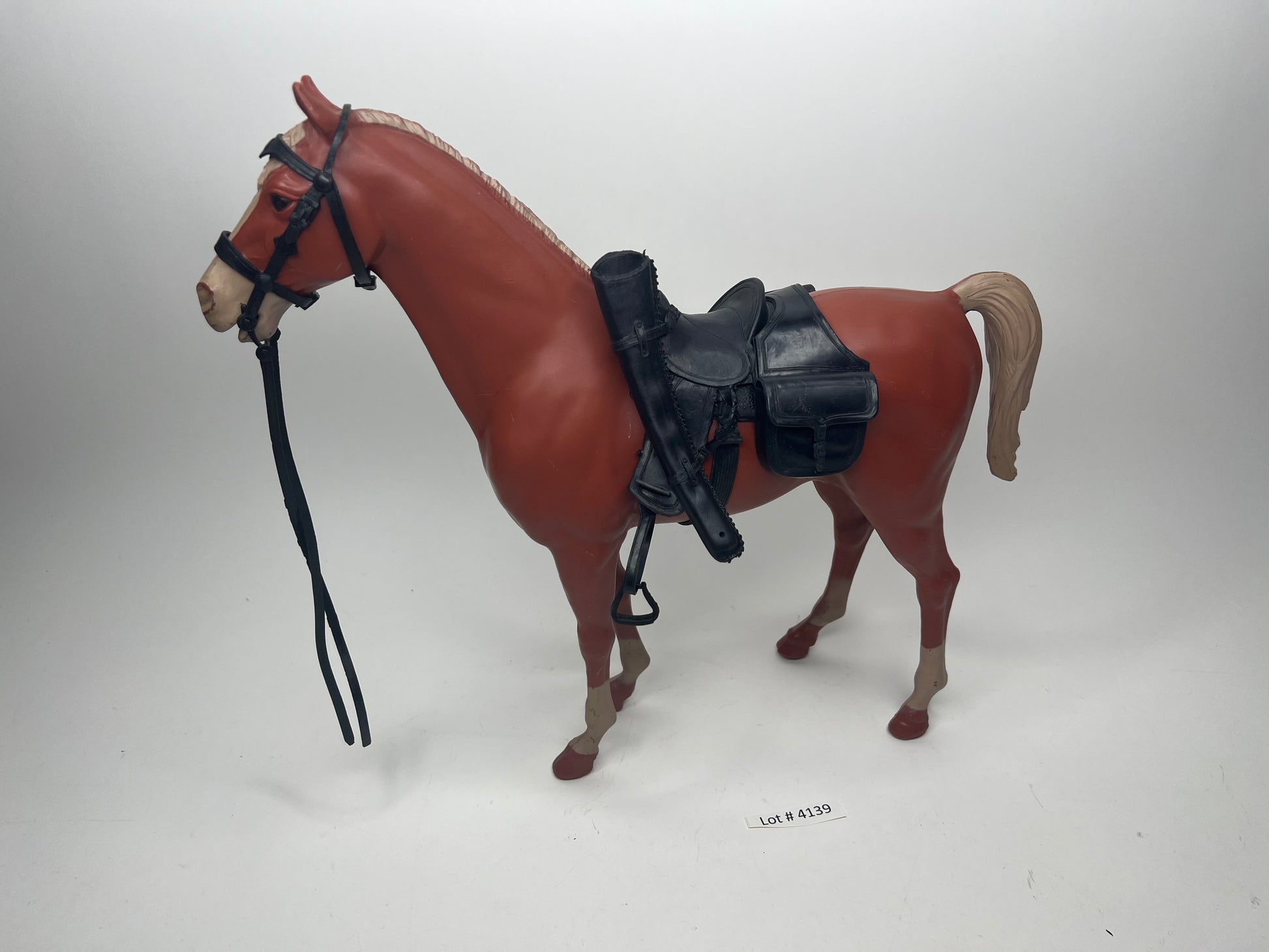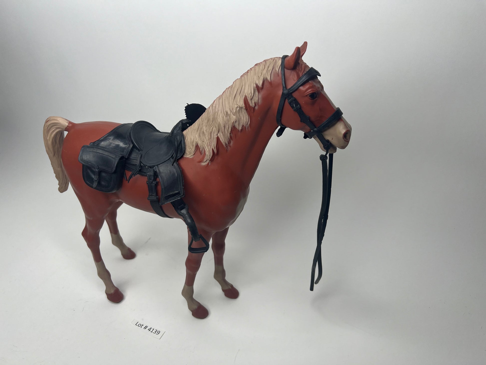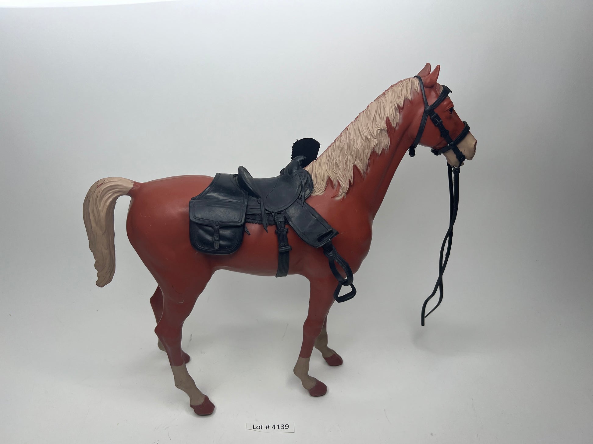 Thunderbolt Horse in sorrel color from a wagon set . Wheels intact! C9-C9+ Horse! A beauty! Comes with Full set of black vintage western tack all vintage displays beautiful. 15/15 pieces of black tack . Free Shipping and insurance in the US!